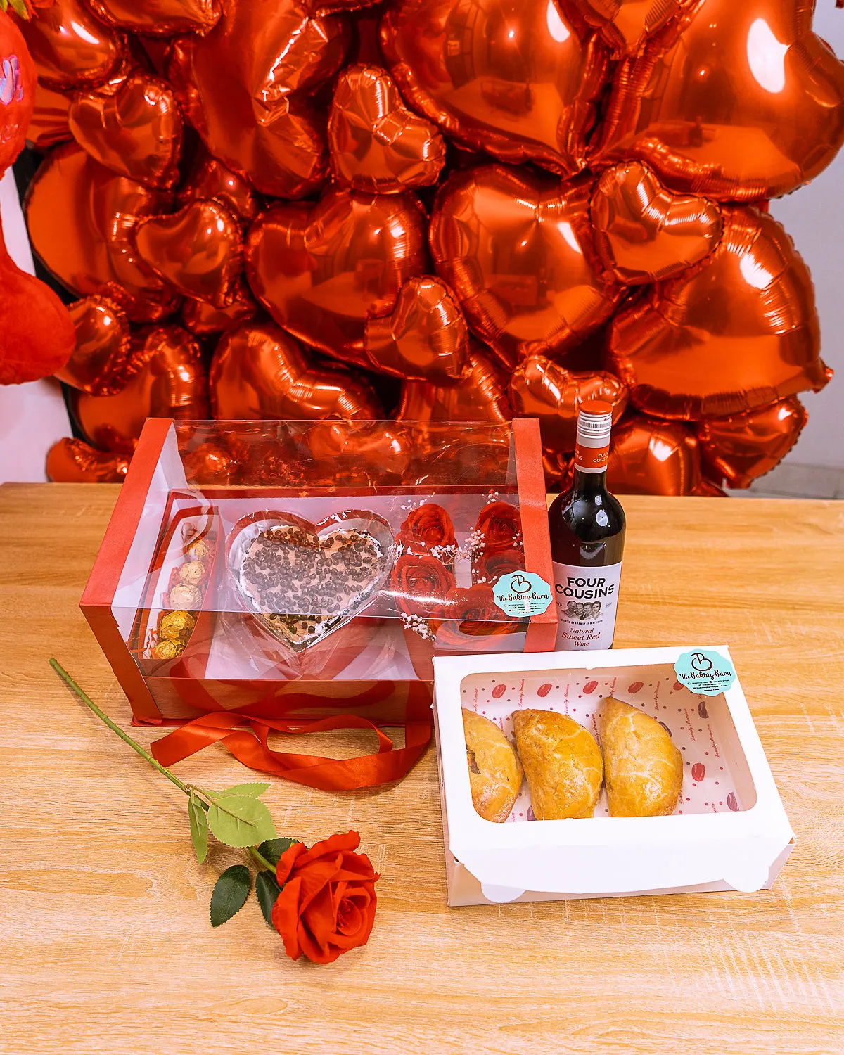 For the ultimate romantic gesture, choose the All For You Package from The Baking Barn NG, Lekki. This comprehensive gift set balances sweet and savory, featuring a 2-layer, 6-inch cake made of our signature slices and 4 decadent Whinny chocolates. We’ve added a savory touch with a box of 6 pastries—3 chicken pies and 3 sausage rolls—all baked to golden perfection. Complete with fresh flowers and a bottle of wine, it is the complete Valentine’s experience.