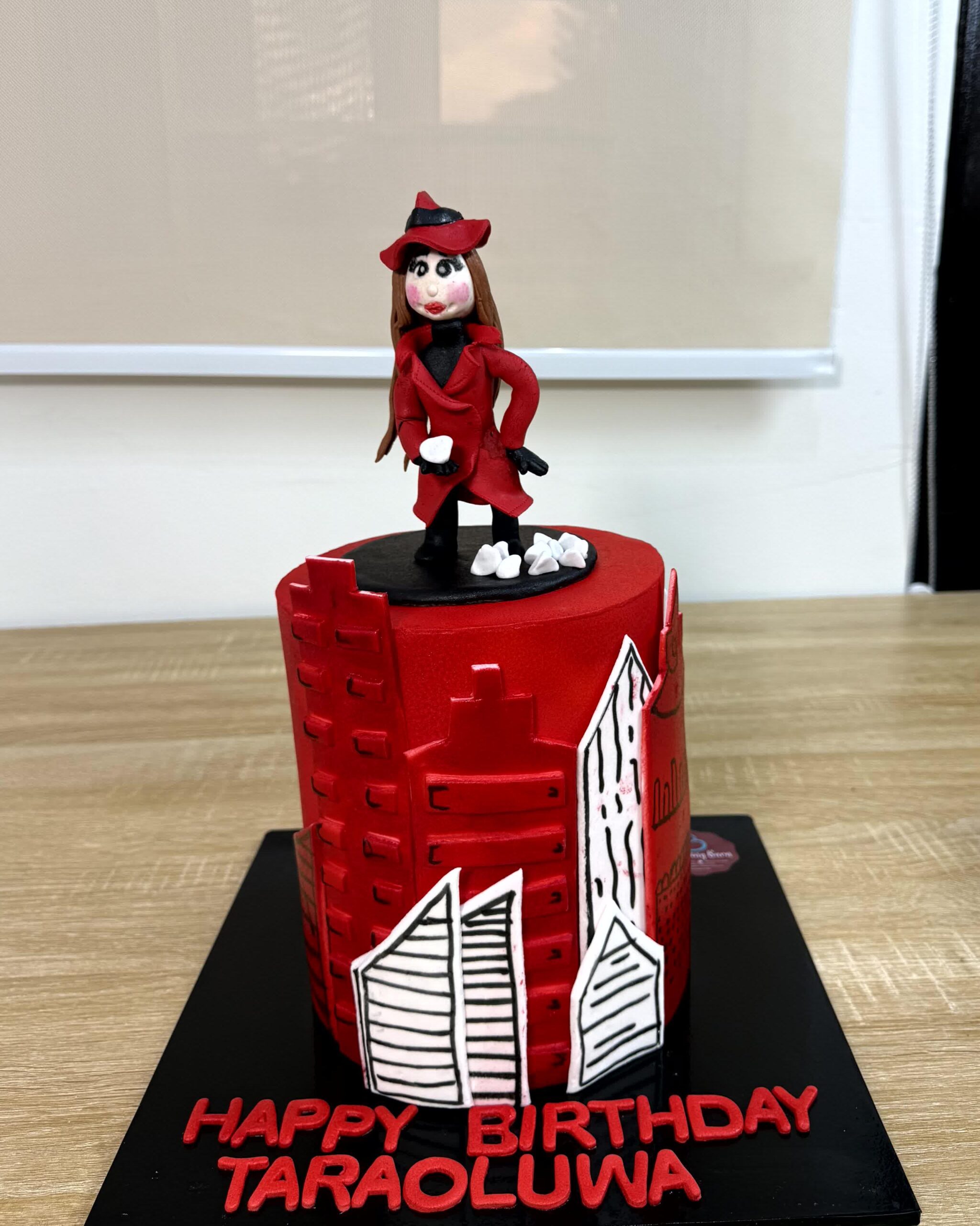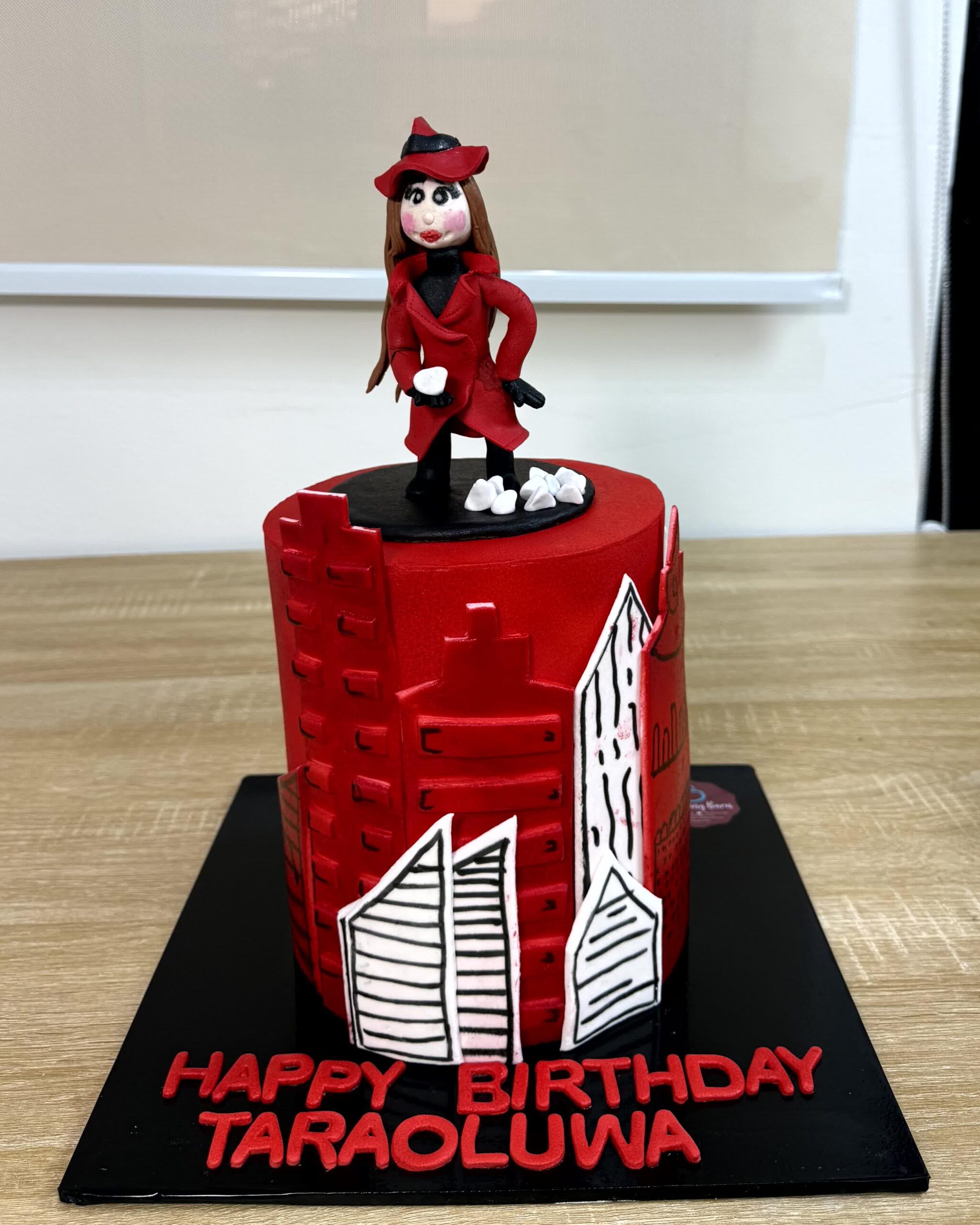 Embark on a mystery-filled celebration with our Carmen Sandiego Theme Cake! This adventurous design captures the spirit of the world’s most famous traveler, featuring a striking red fondant finish, her signature fedora topper, and global travel accents. It is the perfect centerpiece for fans of mystery and adventure who want a bold, high-fashion cake for their big day.