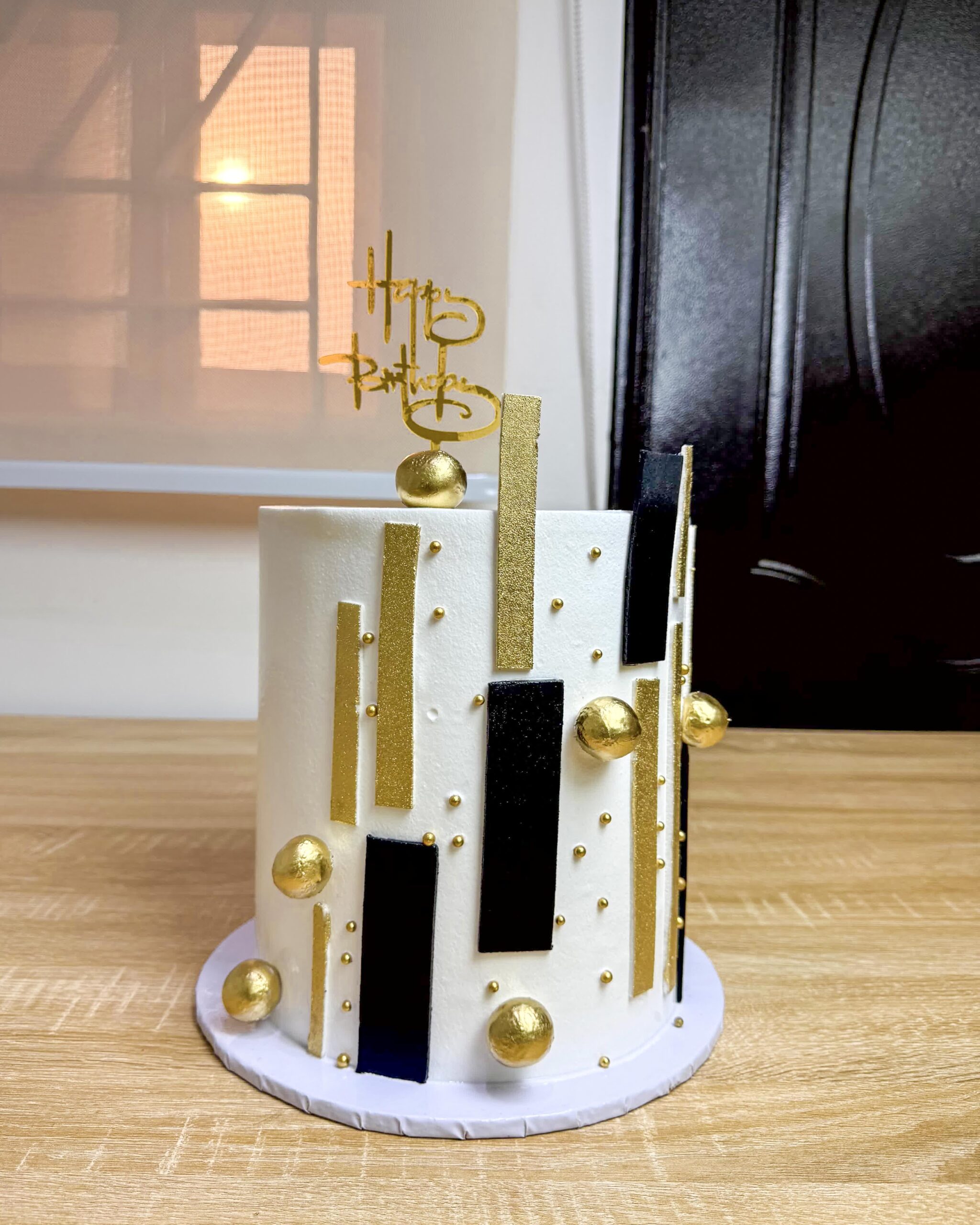 Bring roaring twenties glamour to your celebration with the sophisticated Gatsby Art Deco Cake. This sleek, tall cake features crisp white frosting accented by dazzling gold glitter bars and sharp black stripes, finished with shimmering edible gold spheres. It’s the ultimate showstopper for 21st, 30th, 40th birthdays, or any upscale event demanding a touch of luxury. Handcrafted with style from The Baking Barn NG, Lekki.