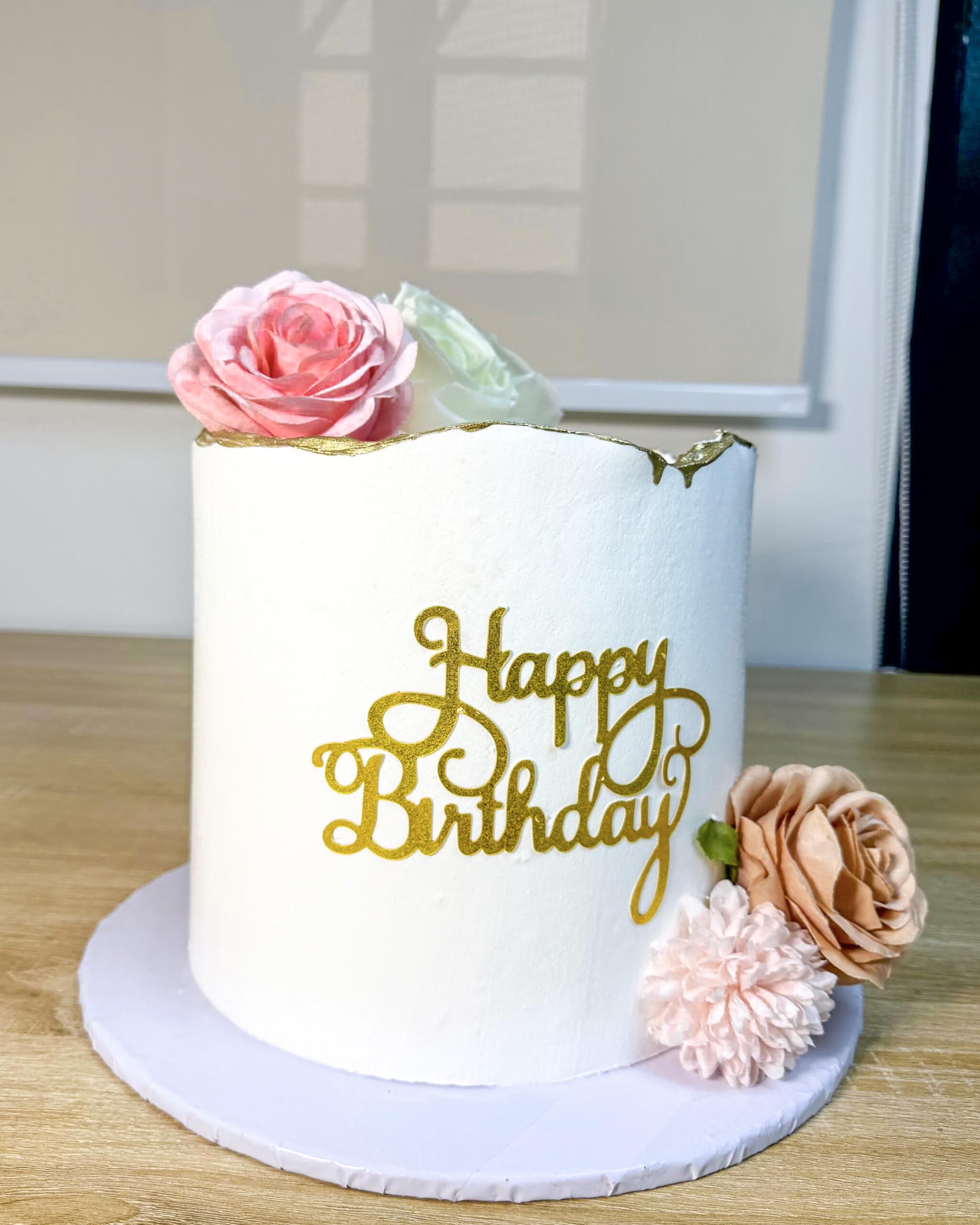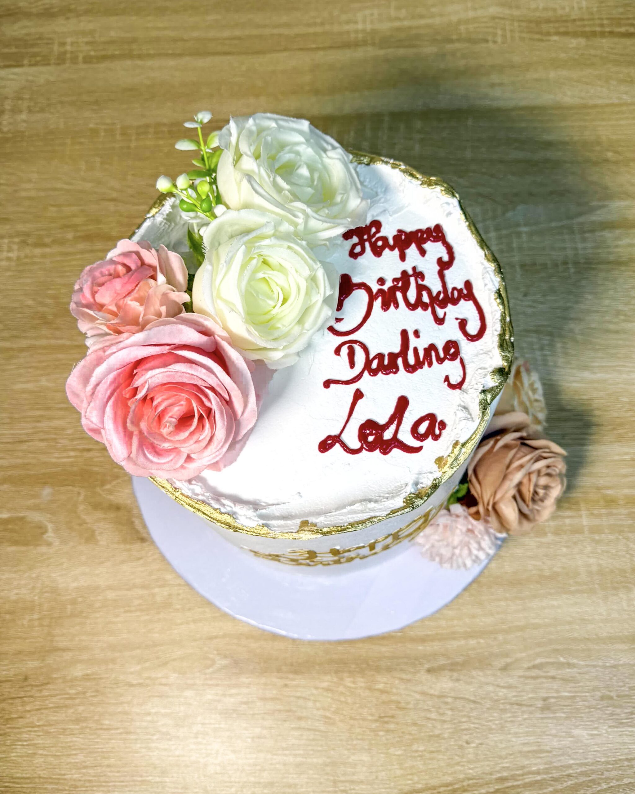 Elevate your celebration with Lola’s Floral Birthday Cake, a perfect blend of modern minimalism and floral charm. This elegant single-tier cake is finished in a crisp white buttercream, featuring a sophisticated hand-painted gold deckled edge at the top. Adorned with delicate roses in soft pink and peach hues, it is a timeless choice for any stylish birthday celebration. Handcrafted for your special moments from The Baking Barn NG, Lekki.