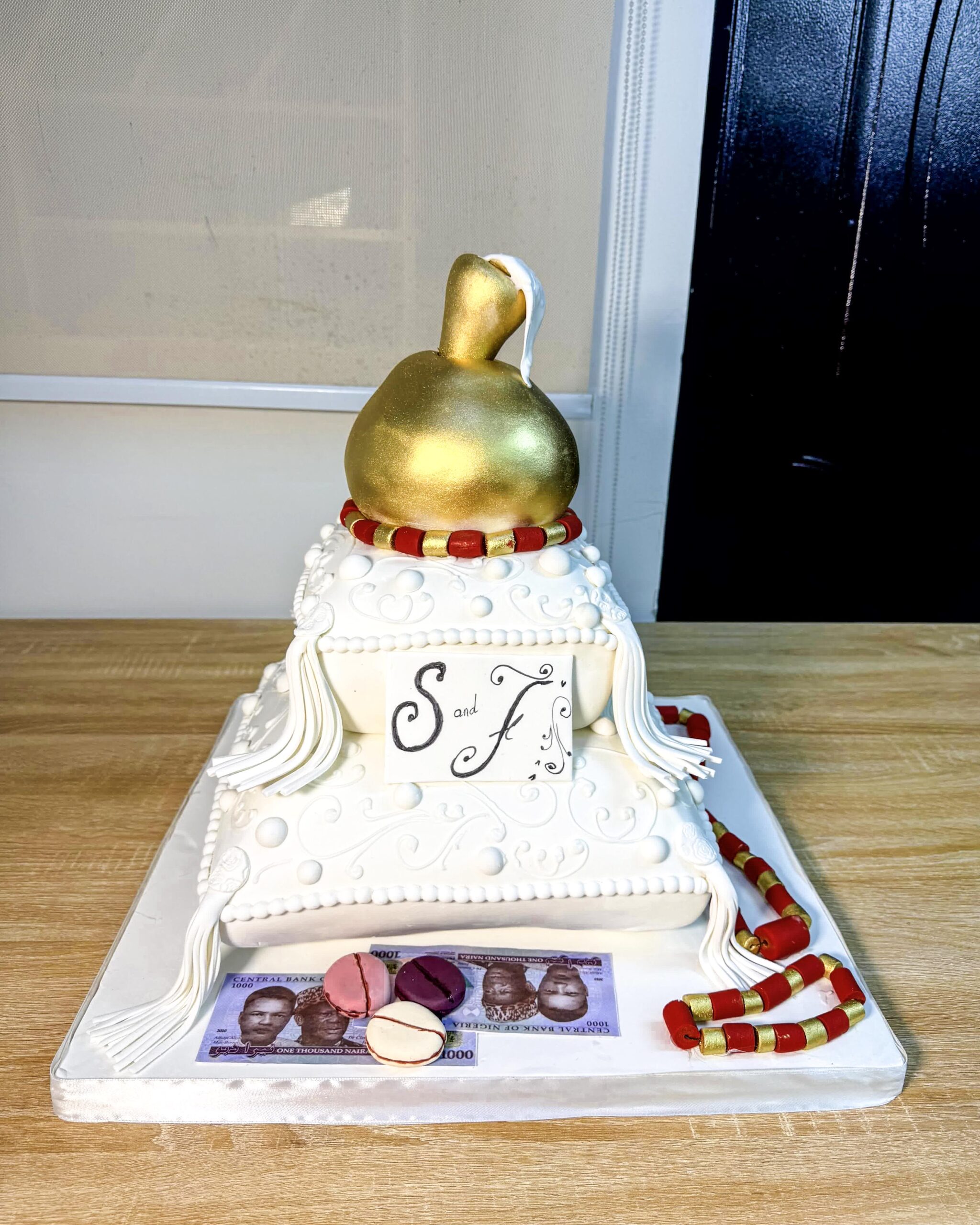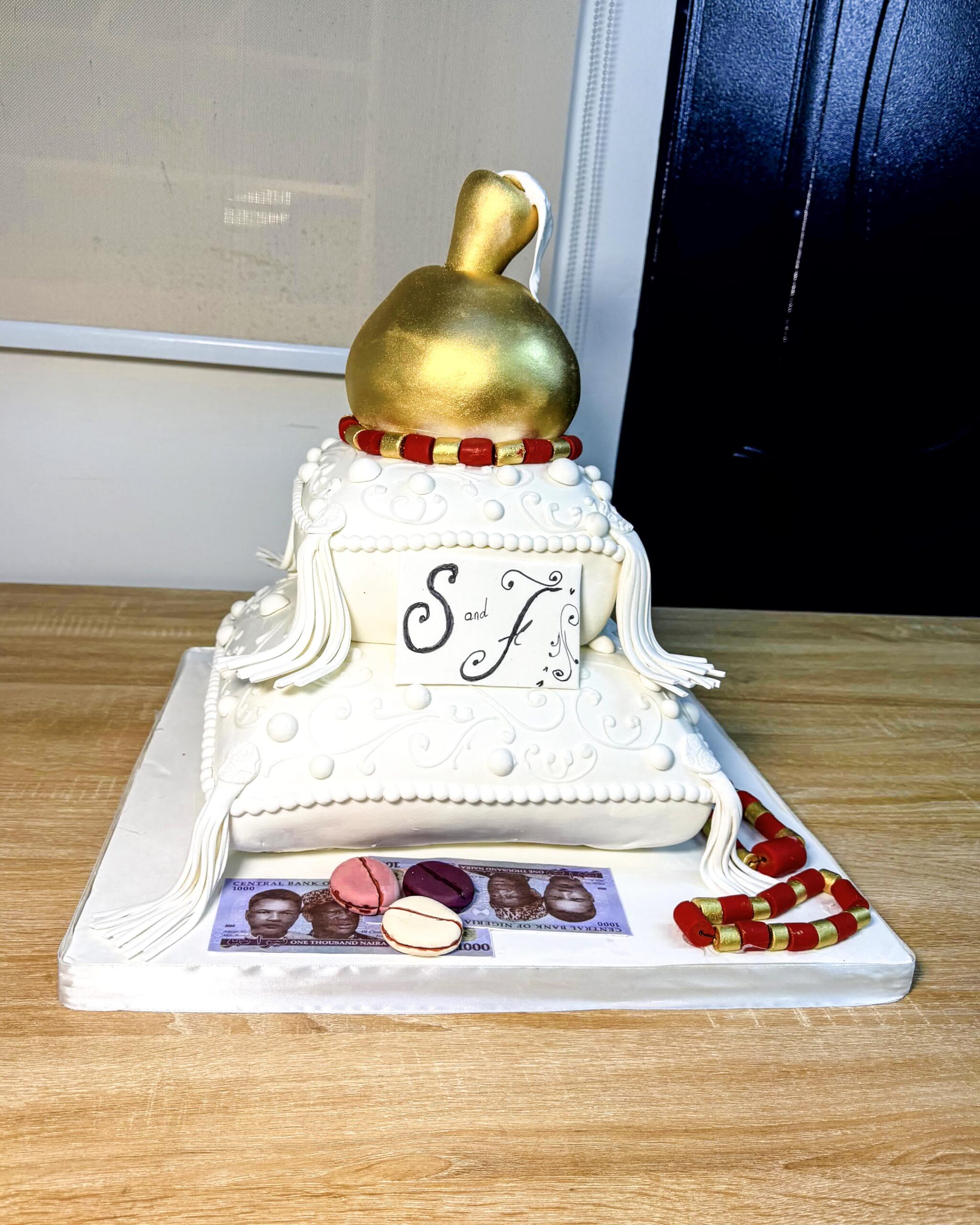Celebrate your Igbankwu or traditional wedding with this stunning Pillow Traditional Wedding Cake. This cake pays beautiful homage to Nigerian culture, featuring an elegant white fondant pillow base, a regal gold ‘money bag’ topper, and intricate details. Complete with edible Naira notes and traditional beads, this masterpiece symbolizes prosperity and heritage, making it the perfect focal point for your engagement or Igbankwu ceremony. Order your customized cake from The Baking Barn NG today.