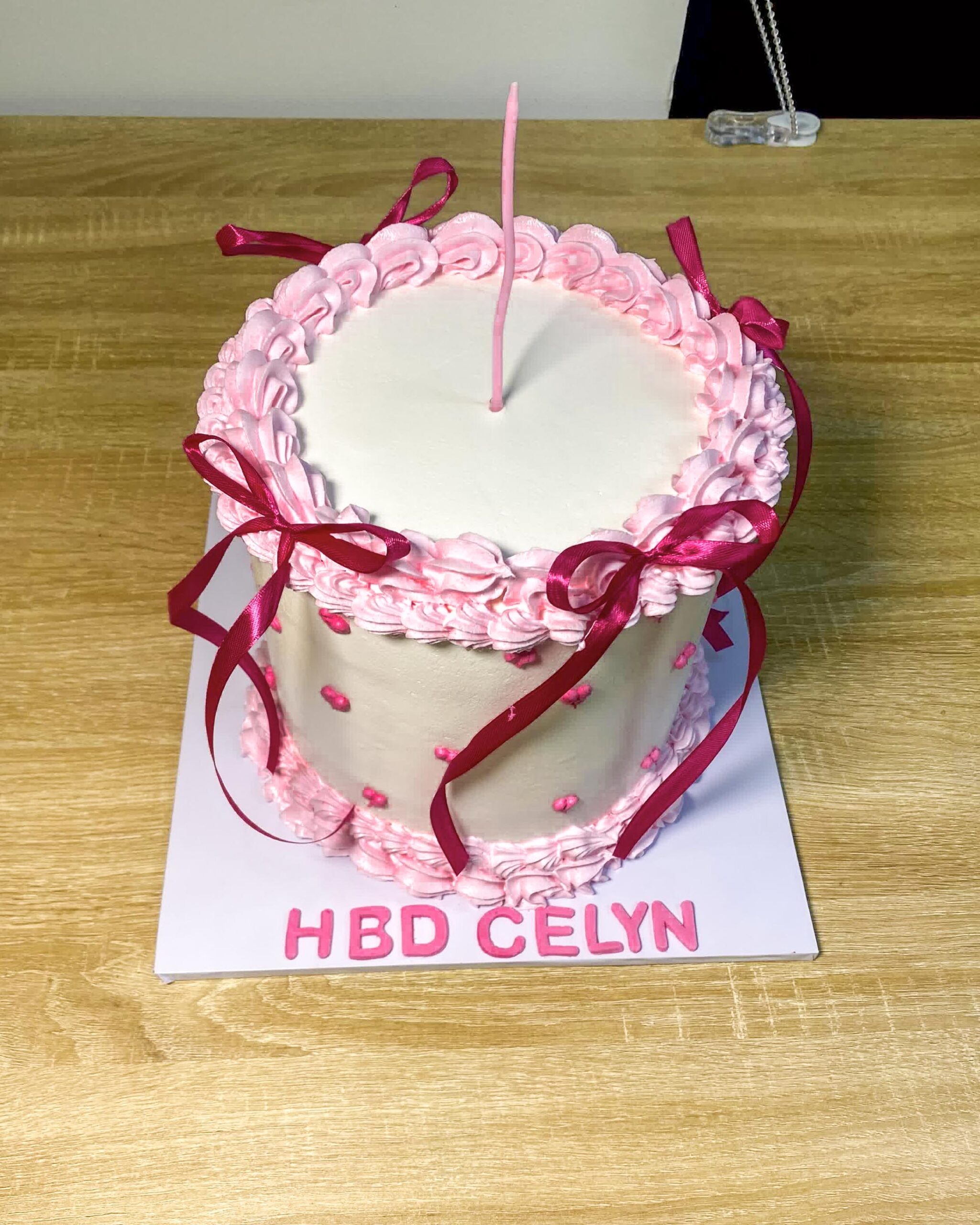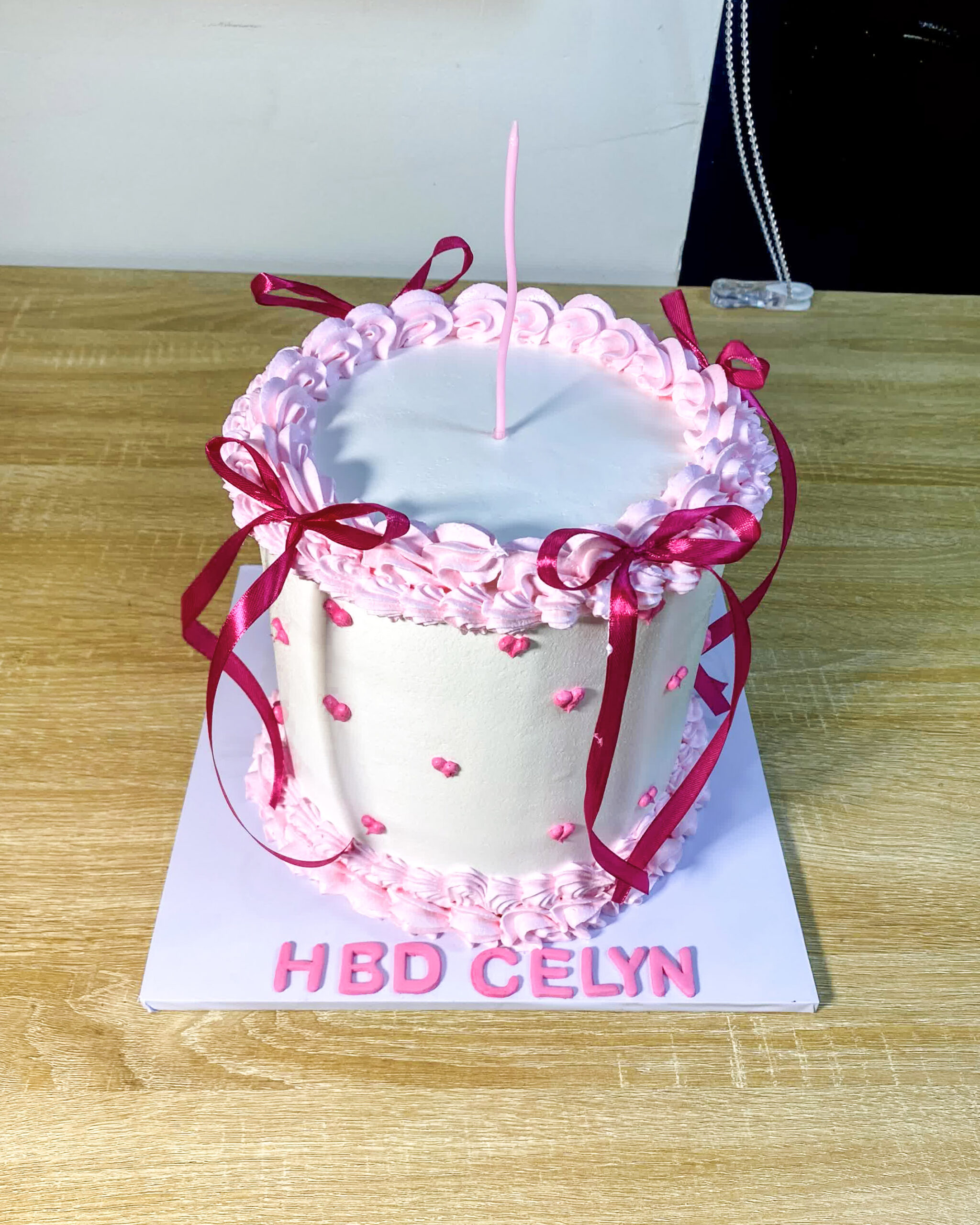 Celebrate cuteness with our delightful Pink Bow Cake! This sweet single-tier design is covered in light, fluffy frosting and adorned with playful piping and beautiful pink ribbon bows around the top edge. Perfect for a young girl’s birthday, a lighthearted celebration, or simply to add a touch of charming elegance to any Lagos gathering. The simple, clean design and vibrant pink accents make it a cheerful centerpiece!