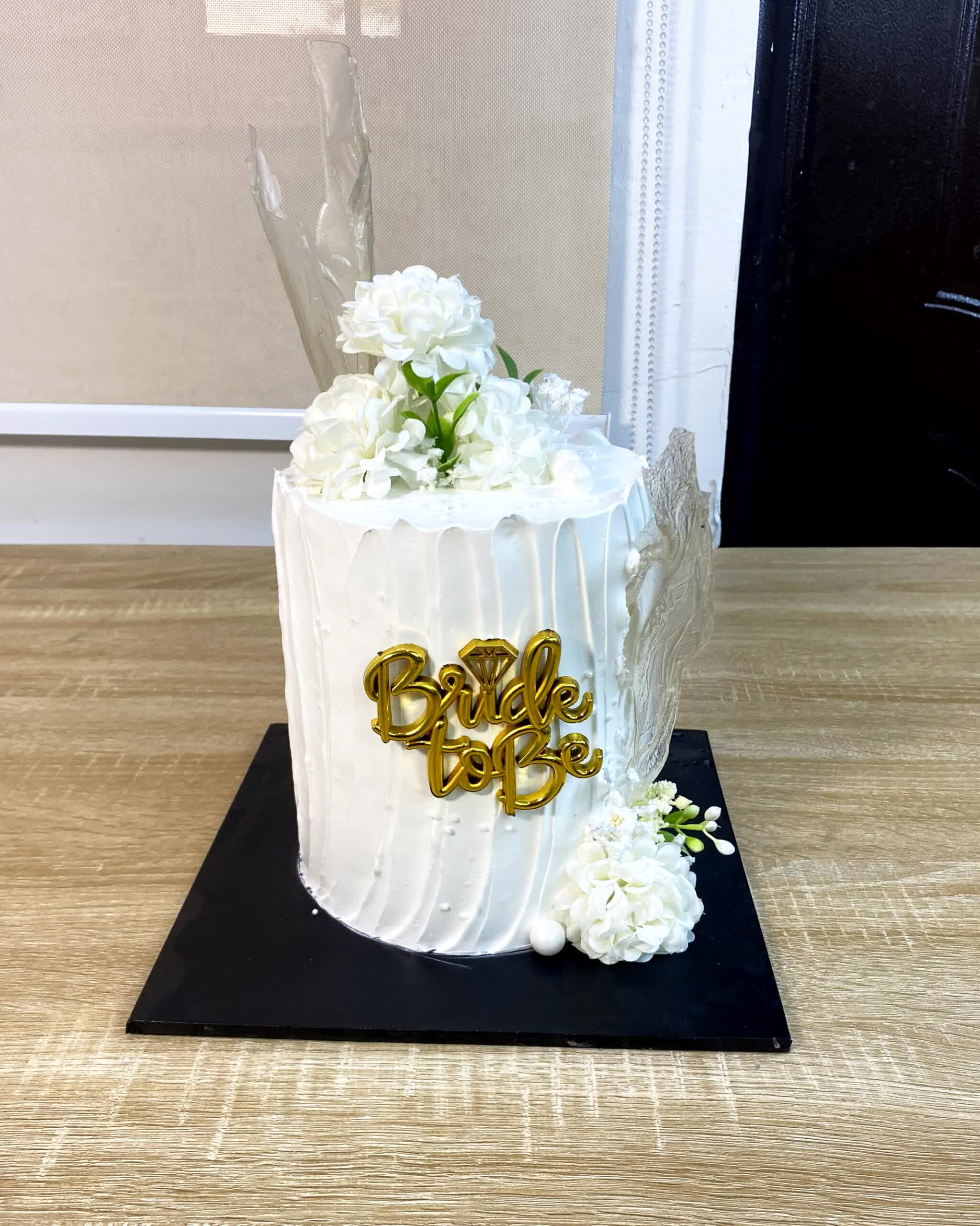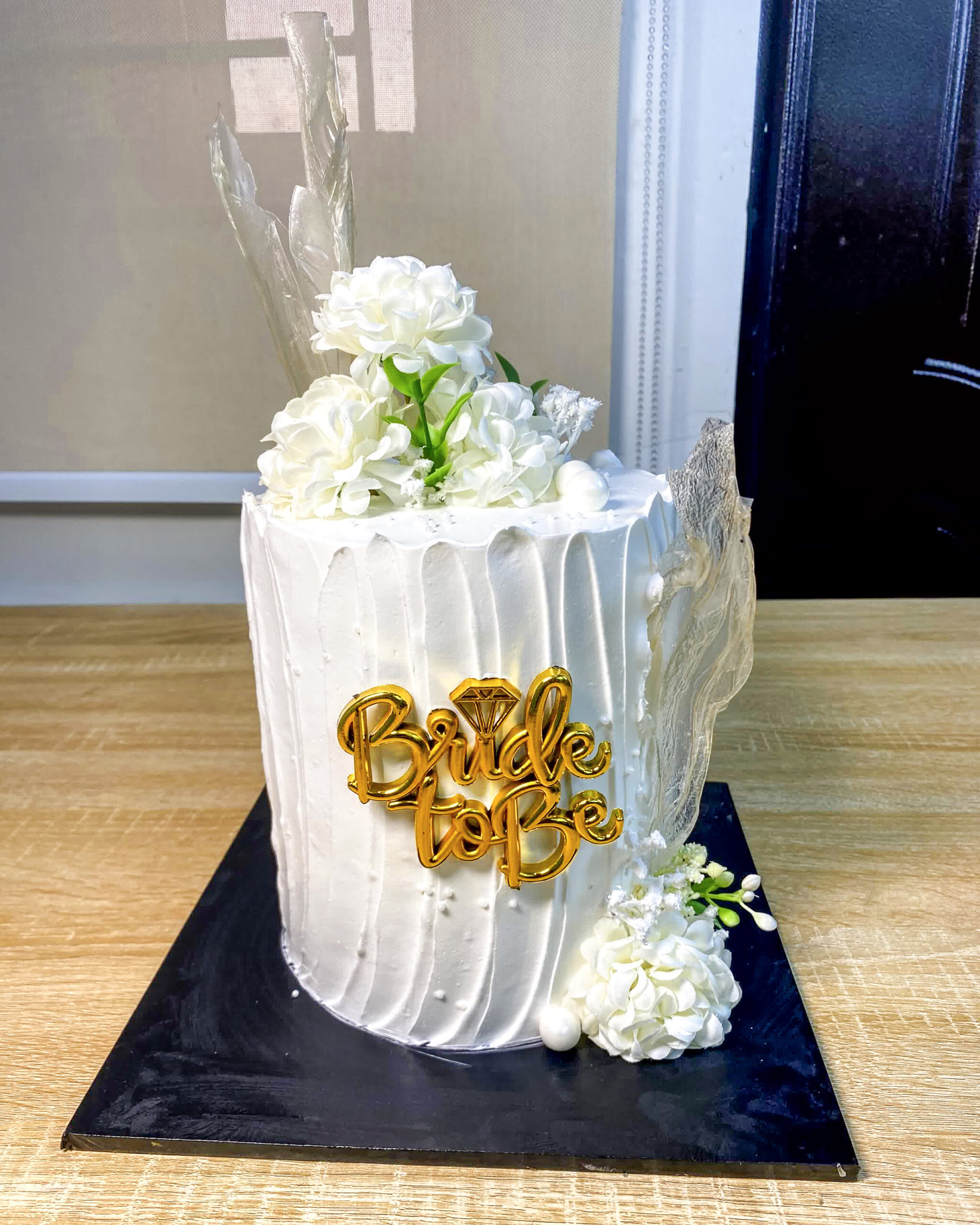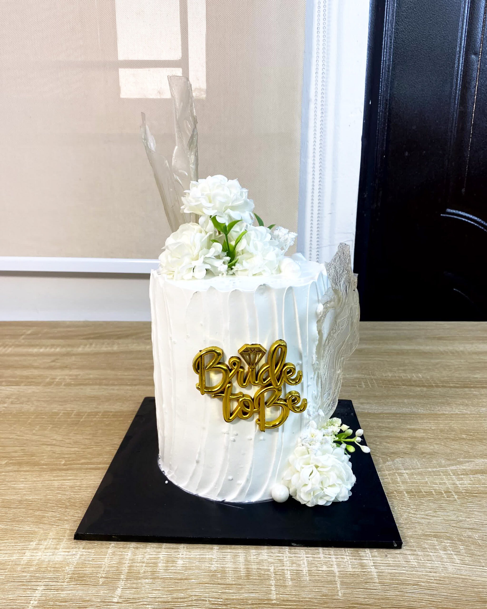 Make her bridal shower unforgettable with our Simple Bridal Shower Cake. This stunning single-tier masterpiece features a clean, textured white buttercream finish, adorned with delicate white floral accents and shimmering pearls. Topped with a signature gold “Bride to Be” topper and elegant sail decorations, it is the perfect centerpiece for a sophisticated Lagos bridal shower. Handcrafted with love from The Baking Barn NG, Lekki.