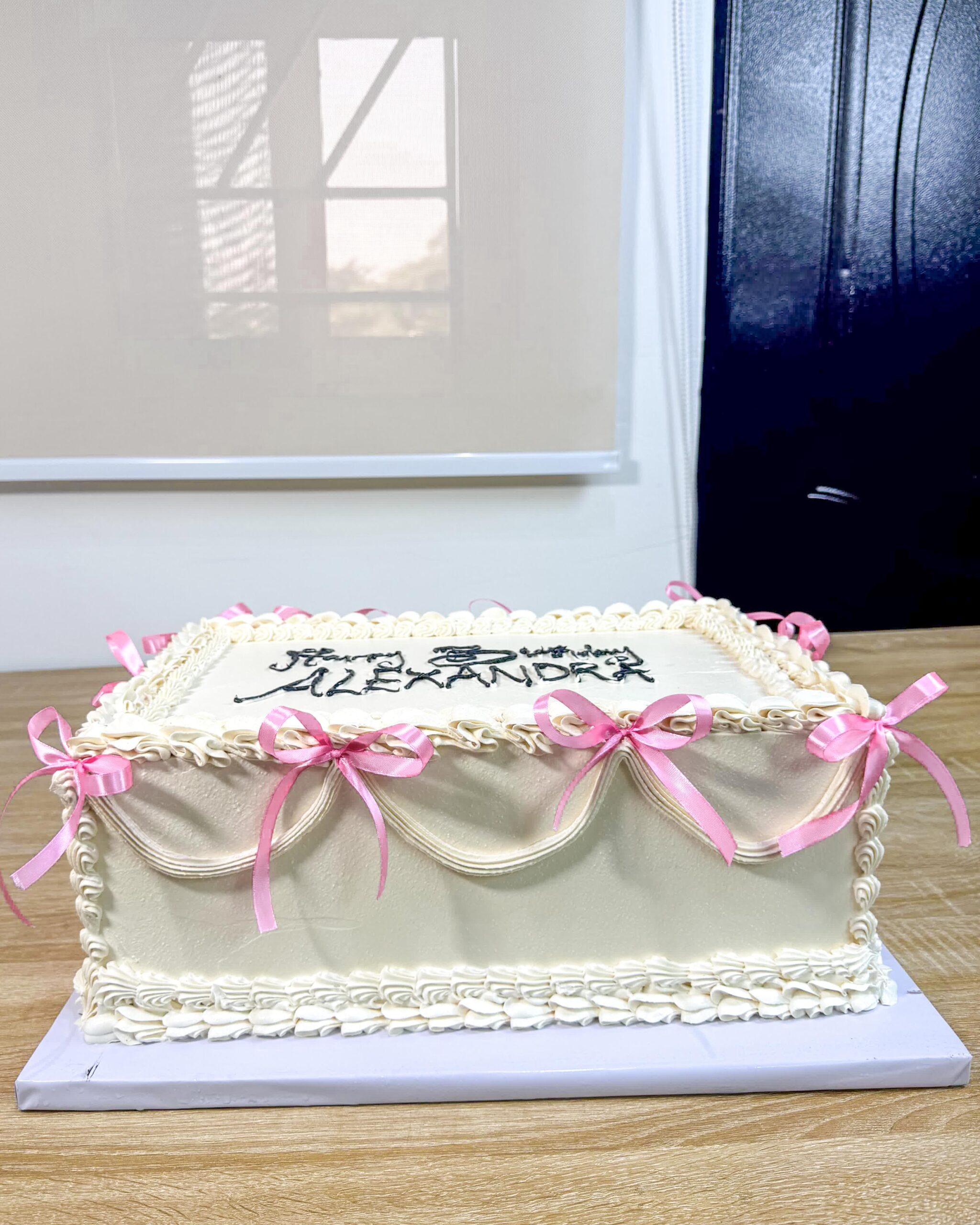 Our Slab Cake is the perfect blend of timeless style and practical design, making it ideal for feeding a crowd at birthdays, office parties, or family gatherings. This rectangular masterpiece features a smooth, rich buttercream finish with intricate ruffled piping and classic borders. Adorned with delicate pink satin bows for a trendy, feminine touch, it’s a beautiful centerpiece that’s as delicious as it is stylish. Make your next big event memorable with this handcrafted treat from The Baking Barn NG, Lekki.